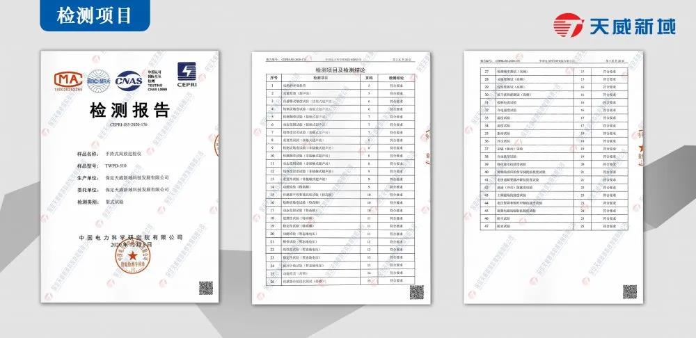 2020年公司对产品进行了进一步改进升级,已批量生产的TWPD-510手持式局部放电巡检仪、TWPD-2823手持式局部放电巡检仪,随机抽样送中国电力科学研究院进行检测和型式试验,其中TWPD-510手持式局部放电巡检仪检测项目47项、TWPD-2823手持式局部放电巡检仪检测项目29项,检测结论证明我司产品性能指标满足相关标准。