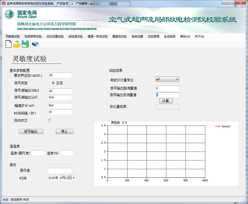 非接触式超声波局部放电检测仪校验系统的智能测控软件能够实现一键自动完成电压调节、频率调节、声压计自动设置等功能,软件界面如下: