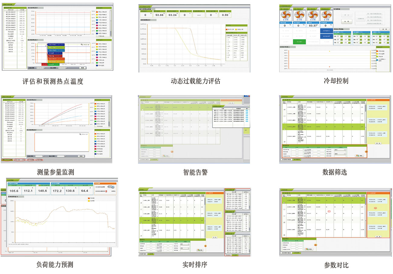 1、评估和预测热点温度。根据负荷电流、顶层油温、环境温度等在线监测数据,结合变压器基本参数(容量、电压电流、类型、冷却方式等)和试验数据,实现动态评估和预测绕组的热点温度。