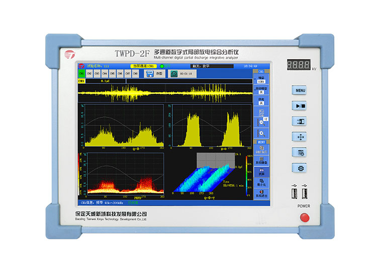 新一代 TWPD-2F 局放分析仪,可满足各类高压电气设备及特种设备的交直流局部放电检测和定位,支持局部放电的多种分析方法。该仪器采用 3D 整体设计,结构紧凑,外形美观,可靠性高,同时满足电力系统现场恶劣电磁环境的可靠性和试验室的高精度要求。 该仪器具有强大的局部放电综合分析能力和小信号强干扰环境局部放电检测能力。独立 8 通道设计,高达 20MHz 的通道带宽、 80MHz 的采样率,使仪器能够对 IEC60270 标准未覆盖的放电频域进行分析,时域放电脉冲保真度更高,可实时对放电脉冲进行时频分析,增强局部放电信号识别的准确性。适用于各种电压等级和容量的变压器、GIS、电缆等高压电气设备的局部放电检测及定位。
